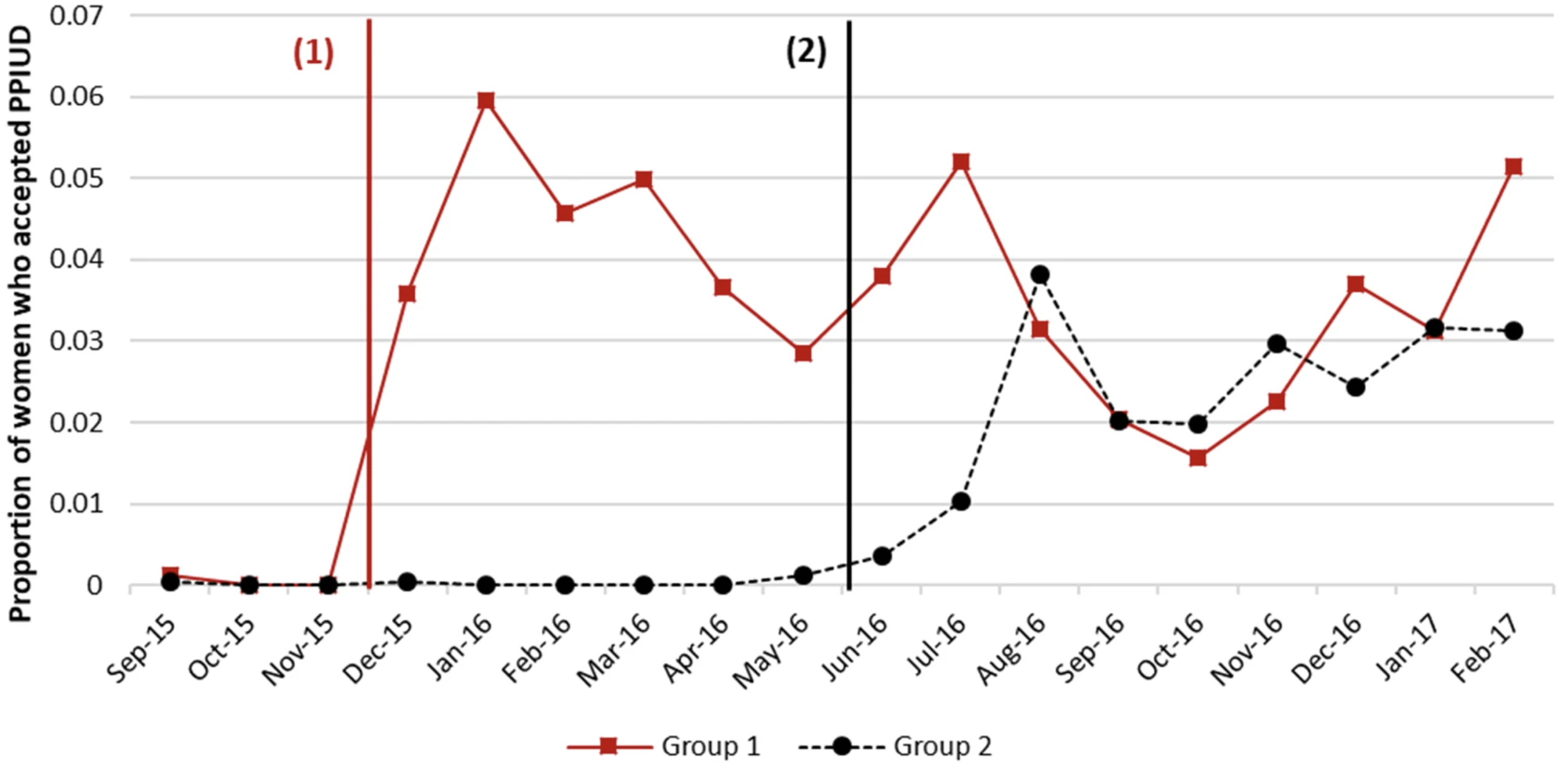In our second example, Pradhan et al. (2019) used a stepped-wedge design to estimate the causal effect of offering postpartum family planning counseling on the proportion of new moms who opt to have an IUD inserted following childbirth. In this design, which you’ll meet more formally in ?sec-experimental, the counseling intervention was turned on in six hospitals in a stepwise fashion. The three hospitals randomly assigned to Group 1 received the intervention first in a staggered start. Approximately six months later, the remaining hospitals began offering the counseling intervention, one after the other. Figure 3.3 demonstrates that rates of uptake appeared to jump in each group after the intervention was introduced. The authors estimated that the intervention increased IUD uptake by 4.4 percentage points [95%CI: 2.8–6.4 pp].