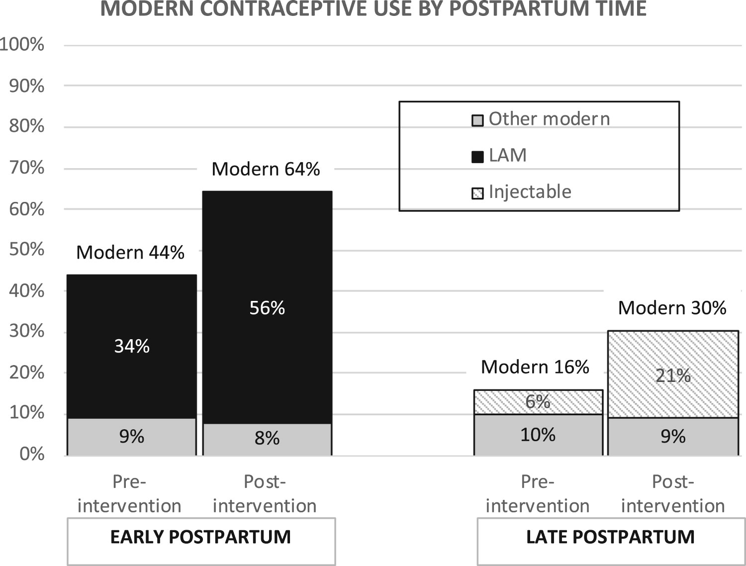 In our first example, Wu et al. (2020) looked at the prevalence of modern contraceptive use in a rural municipality in one of Nepal’s poorest districts before and after a pilot program called Nyaya Health Nepal was implemented. In this program, community health workers conducted home visits with pregnant women and new mothers and offered them contraceptive counseling. The authors reported that modern method use increased from 29% pre-intervention to 46% post-intervention (see Figure 3.2). But as we’ll discuss in ?sec-quasiexperimental, this non-experimental design requires strong assumptions for attributing the observed change to this program.