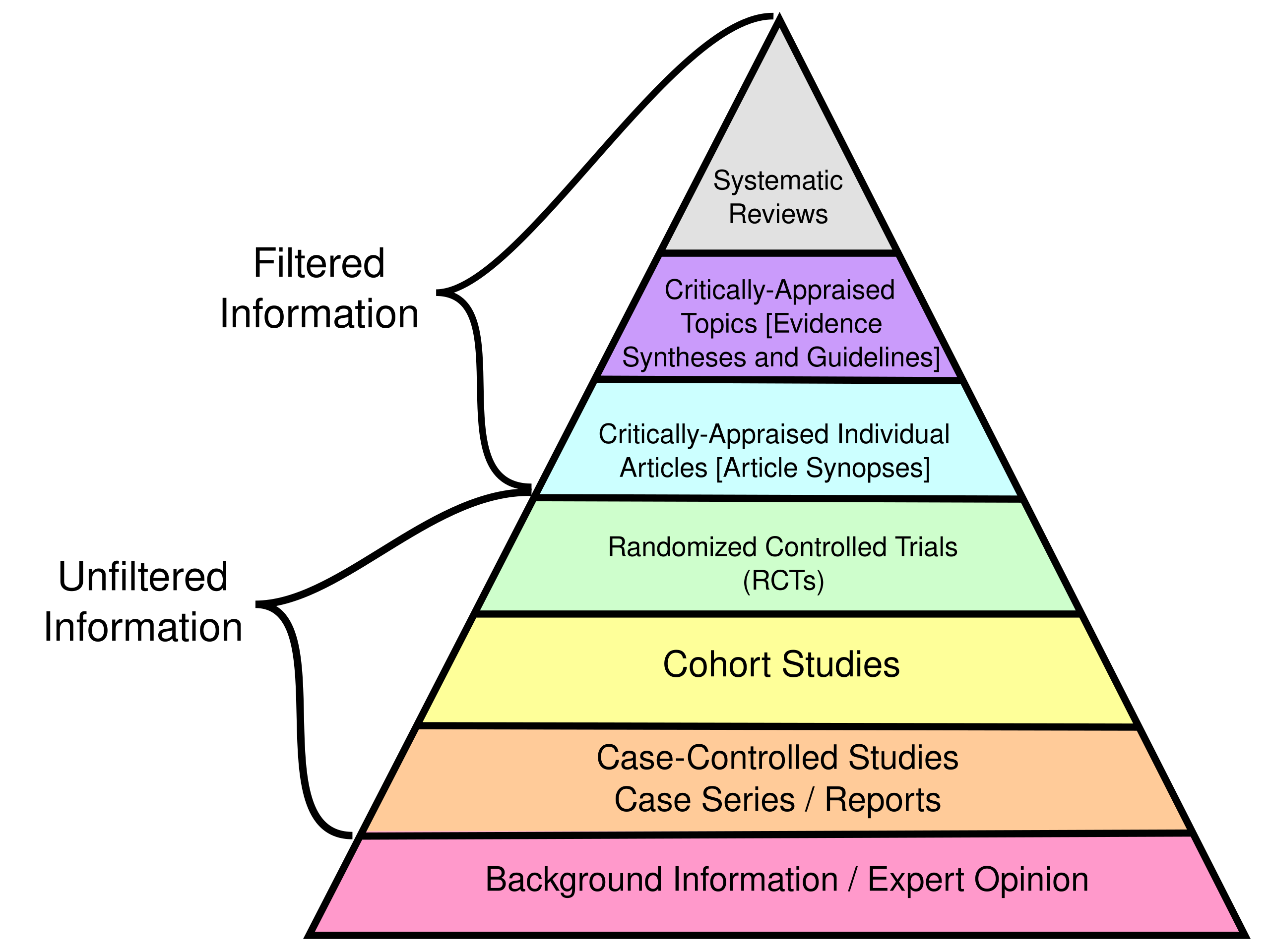 You’ve probably seen versions of the “evidence pyramid” with systematic reviews and meta-analyses at the top, followed by randomized controlled trials, cohort studies, case-control studies, case series, and expert opinion at the bottom. The idea is that higher levels represent more reliable evidence because they’re less susceptible to bias.