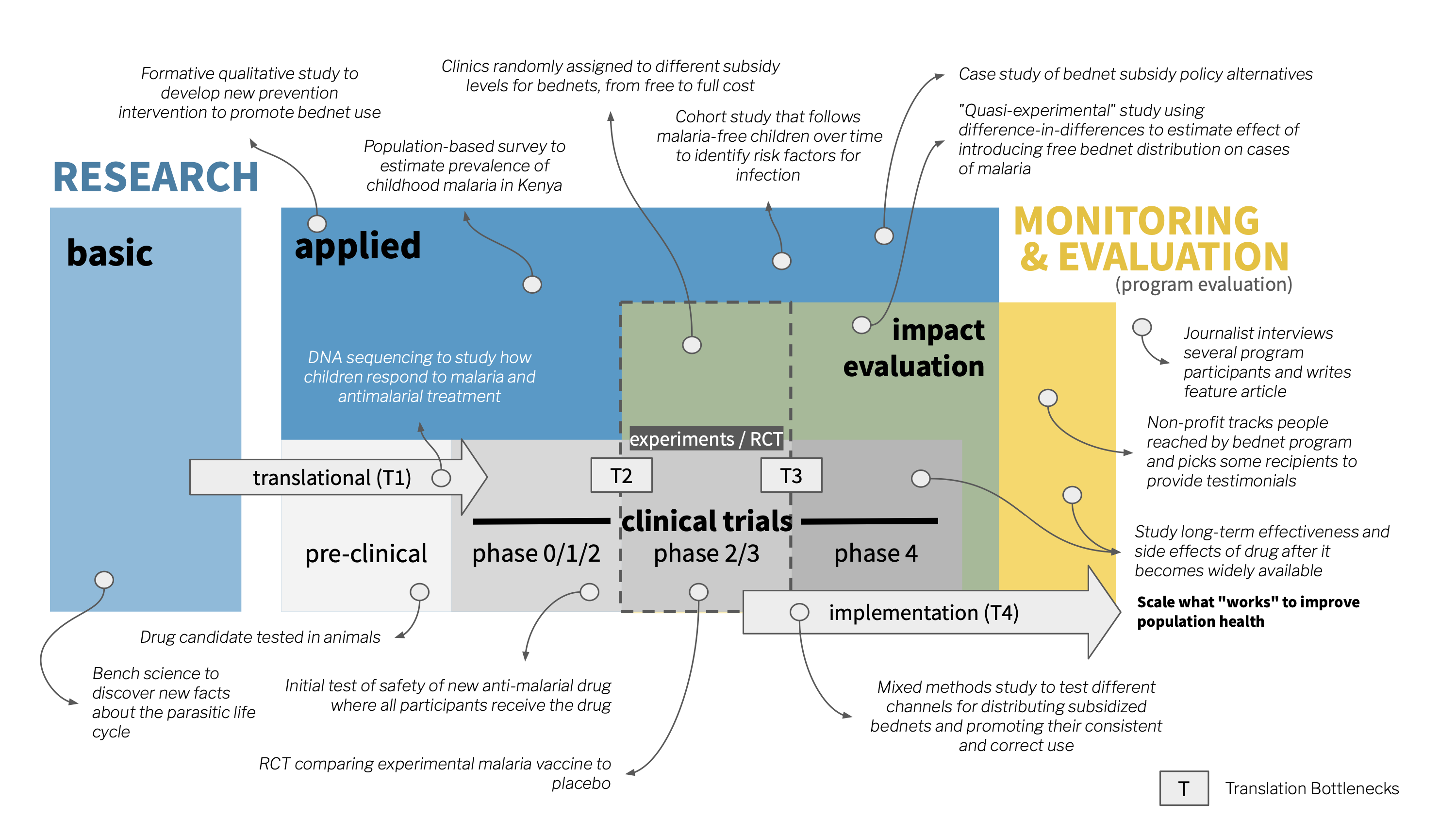 Translational research originally focused on moving from “bench to bedside”, or from basic research in the lab to clinical research with humans (T1), and later expanded to address the challenge of moving from early to late-stage human trials (T2). Today we recognize that other bottlenecks (T3 and T4) prevent good ideas from impacting population health and policy (Woolf, 2008).