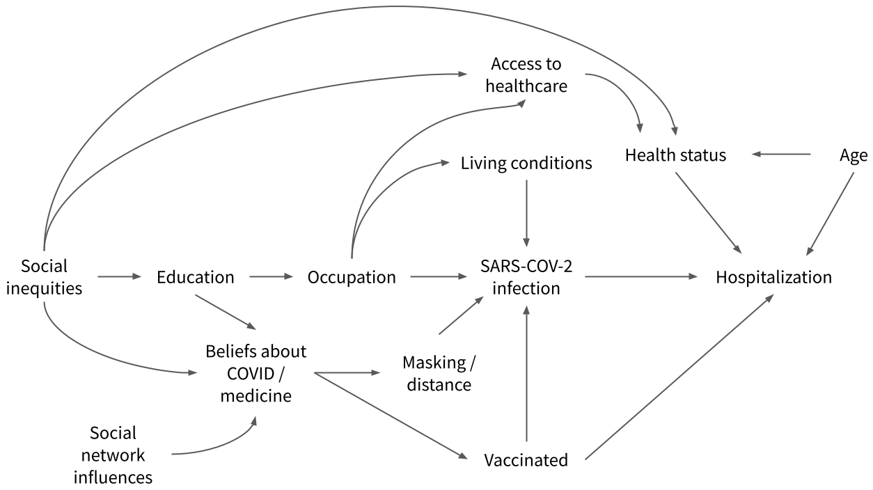 As represented in this DAG, hospitalization with COVID-19 is directly caused by infection with the novel coronavirus, SARS-CoV-2, but who gets infected is not completely random. Infectious diseases are social affairs, and some people are more vulnerable because of their context. For instance, vaccinated individuals are less likely to get infected, and vaccination rates are highest in the U.S. among the most educated. Looking further back in the causal chain, educational attainment is highest among groups without historical social inequities such as systematic racism.
