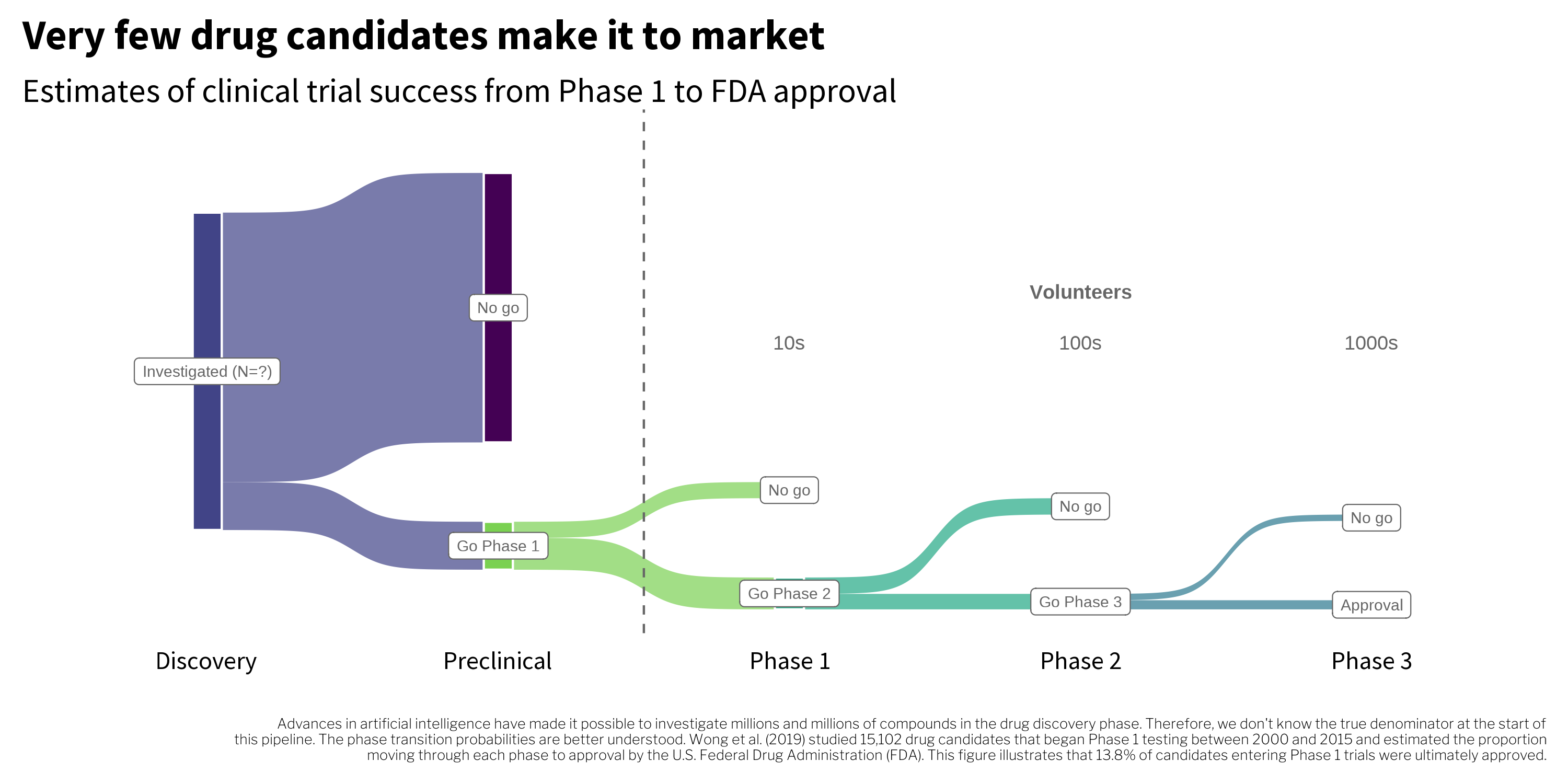 Healthy volunteers and patients like Debbie are the backbone of clinical research. Their sacrifices, combined with the ingenuity of scientists and research teams, have created thousands of medical breakthroughs. But for every new drug approved, there is a trail of failure (see Figure 1.6). Recent studies estimate that fewer than 15% of candidates entering Phase 1 trials are ultimately approved by the FDA (Wong et al., 2019).