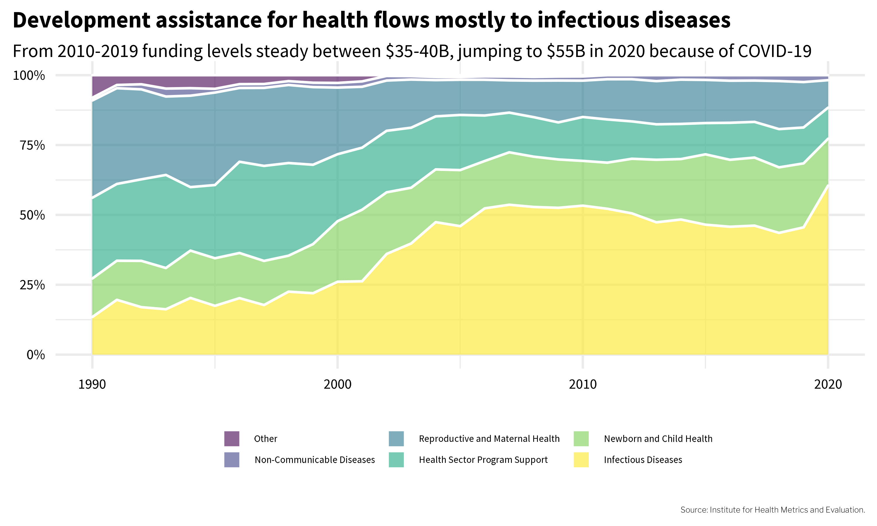 Billions of dollars are spent on global health priorities every year. For instance, the international community disbursed $35-40 billion in development assistance for health yearly from 2010 to 2019. In 2020 this figure jumped to $55 billion because of the COVID-19 pandemic, with the United States accounting for one-quarter of the 2020 total ($14 billion) (Micah et al., 2021). Since the mid-2000s, most of this money has flowed to infectious disease programs (Figure @fig-funding).