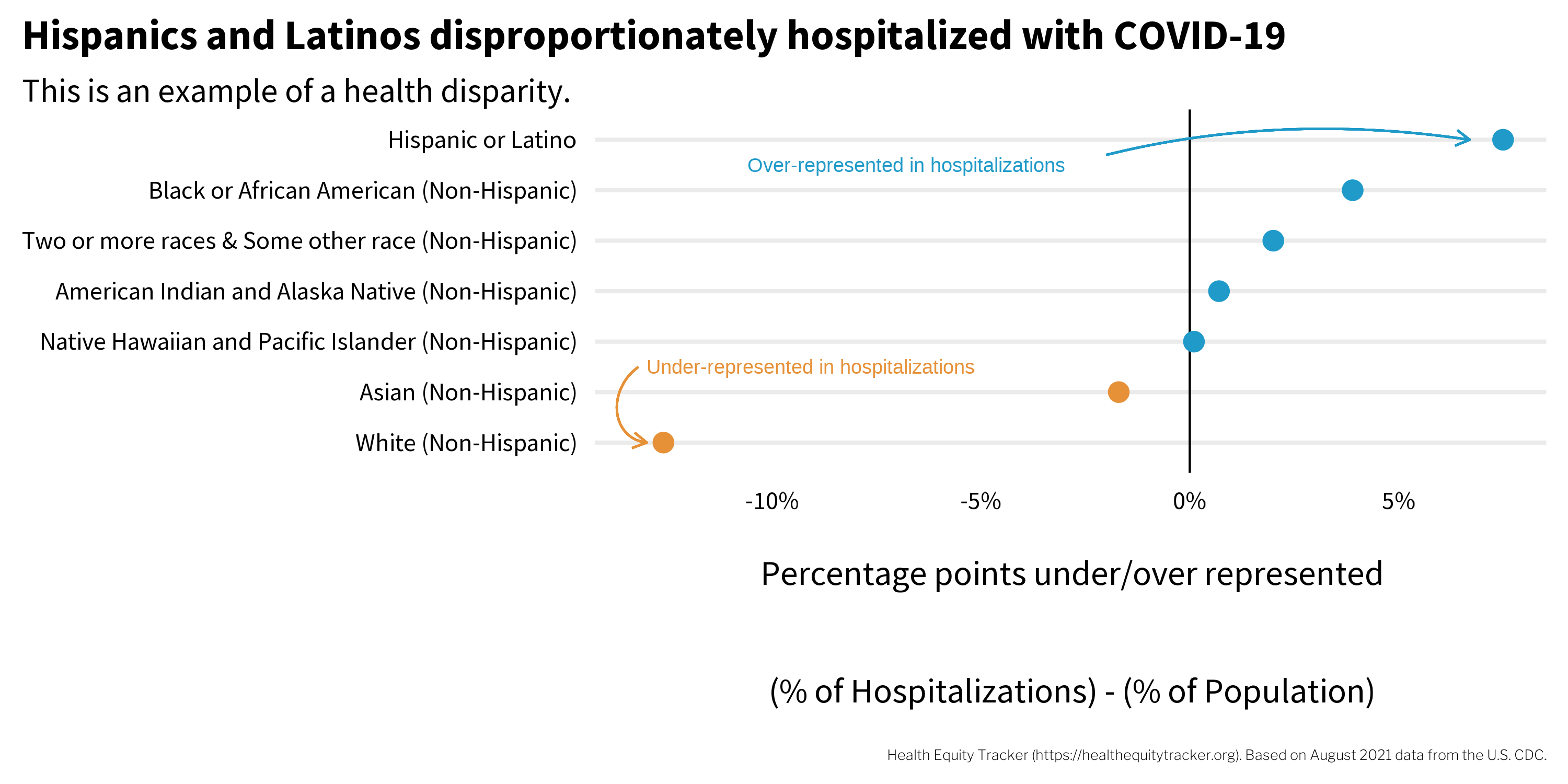 The COVID-19 pandemic has given us many examples of health inequities and disparities. For instance, data compiled by the website Health Inequities Tracker, visualized in Figure 1.1, show that through at least August 2021, Hispanics and Latinos in the United States were over-represented in COVID-19 hospitalizations, while non-Hispanic Whites were substantially under-represented (Satcher Health Leadership Institute, 2021).