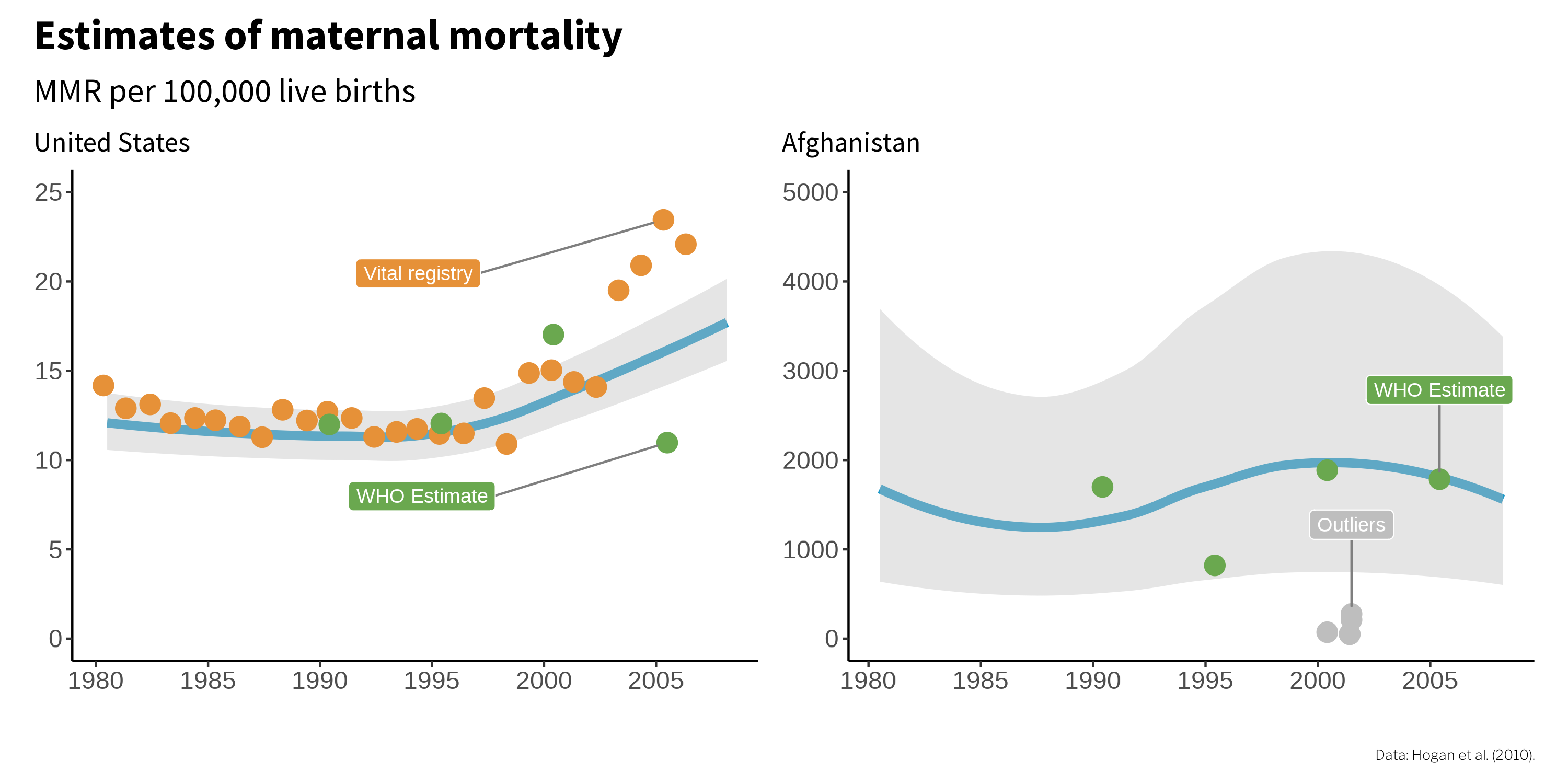 As you can see in the left panel of Figure 1.4, the United States has a (relatively) low level of maternal mortality, between about 10-20 maternal deaths for every 100,000 live child births. Compared to some countries, the US has a lot of data points for estimating the level and trend in maternal deaths, so the uncertainty band is narrow.