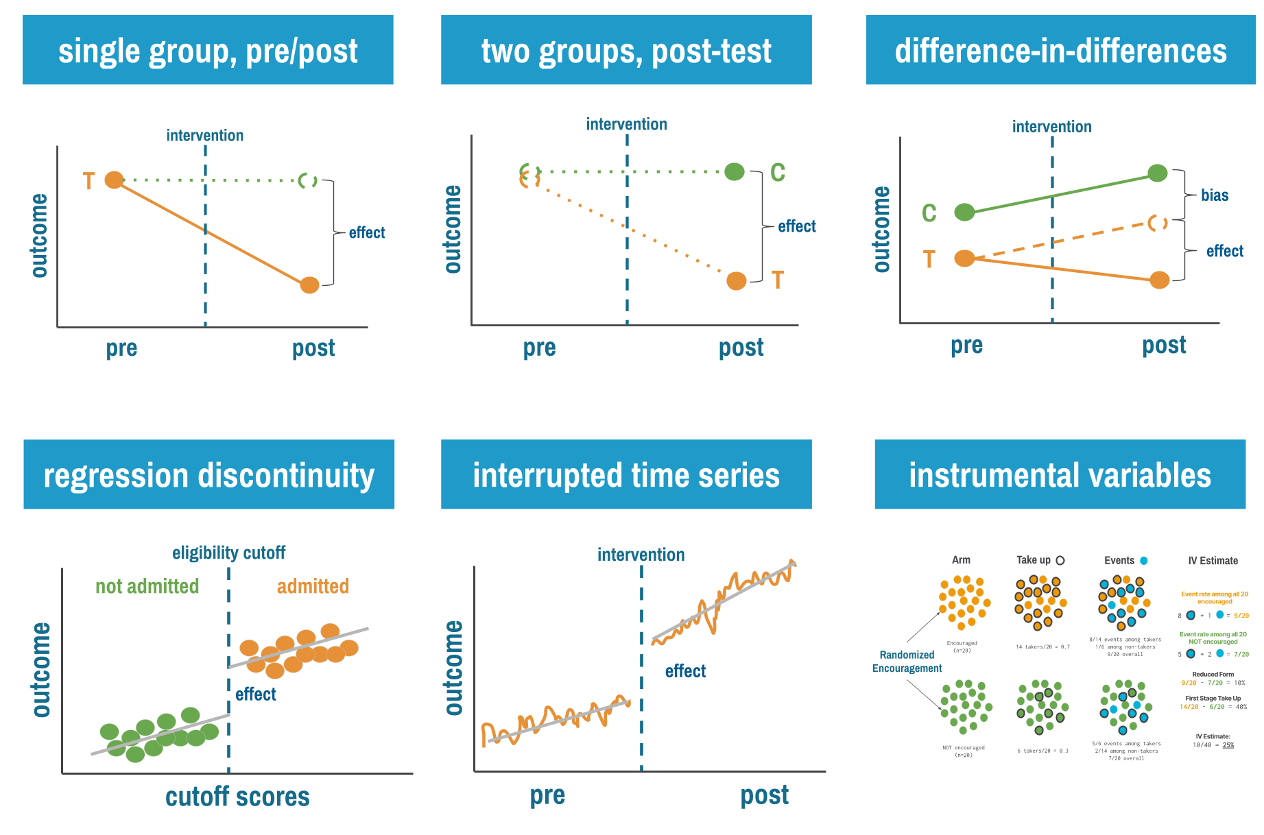 This chapter introduces six quasi-experimental approaches, arranged roughly from simplest to most sophisticated: single group pre-post designs, multiple group post-test only designs, difference-in-differences, interrupted time series, regression discontinuity, and instrumental variables.