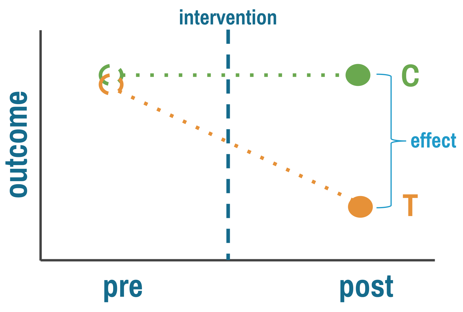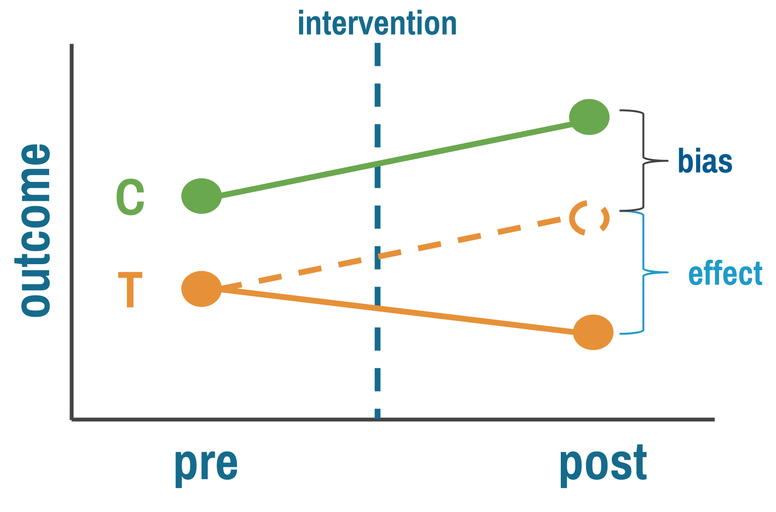 The comparison group’s outcome stands in for what the treatment group would have experienced without the intervention. The key assumption is that the two groups were similar enough before treatment that any post-treatment difference reflects the intervention, not pre-existing differences.
