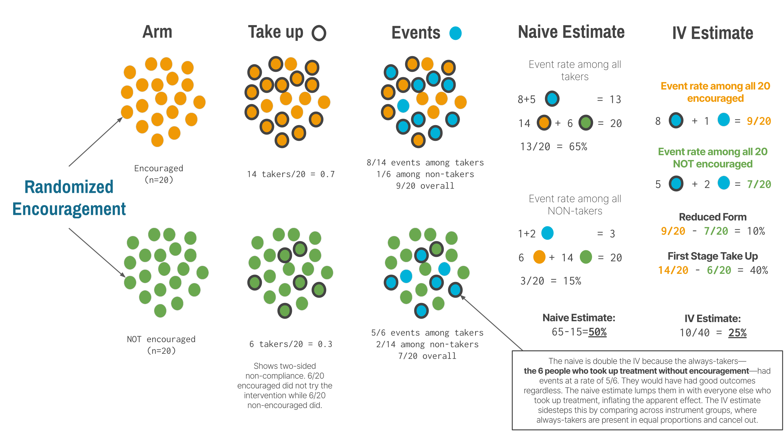 Encouragement designs deserve special attention because they bridge the gap between RCTs and IV. In a standard RCT, you randomize treatment assignment and (hope) everyone complies. In practice, compliance is rarely perfect. Some people assigned to treatment don’t take it up. Some people assigned to control find a way to get treated anyway. An encouragement design embraces this reality: you randomize encouragement (an invitation, a subsidy, a home visit) rather than treatment itself, and use the randomized encouragement as an instrument for actual treatment.