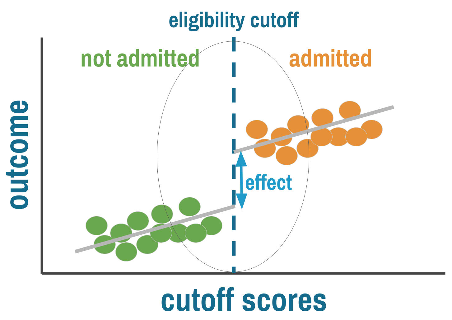 RD also gives you a fundamentally local estimate. You learn the effect of treatment for people near the threshold, not for the population as a whole. The effect of HIV treatment for patients with CD4 counts near 500 may differ from the effect for patients with counts of 200. This isn’t a flaw in the design—it’s a feature that demands honest reporting about who the estimate applies to.