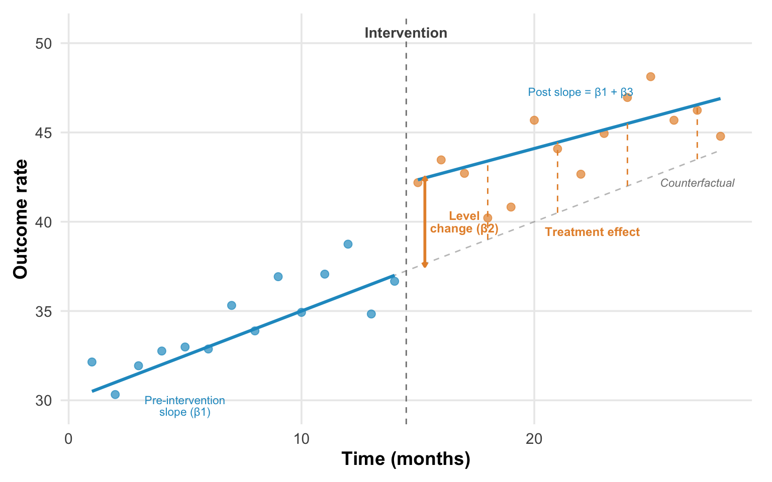 The data demands are real, though. ITS requires many time points—at minimum 8 before and after intervention, ideally more—and the statistical complications of autocorrelation and seasonality can’t be ignored. Concurrent events are the design’s deepest vulnerability: if something else changed when your intervention started, ITS can’t tell the two apart. And the entire approach rests on the assumption that pre-intervention trends would have continued unchanged, which is itself a strong modeling assumption that you can argue for but never prove.