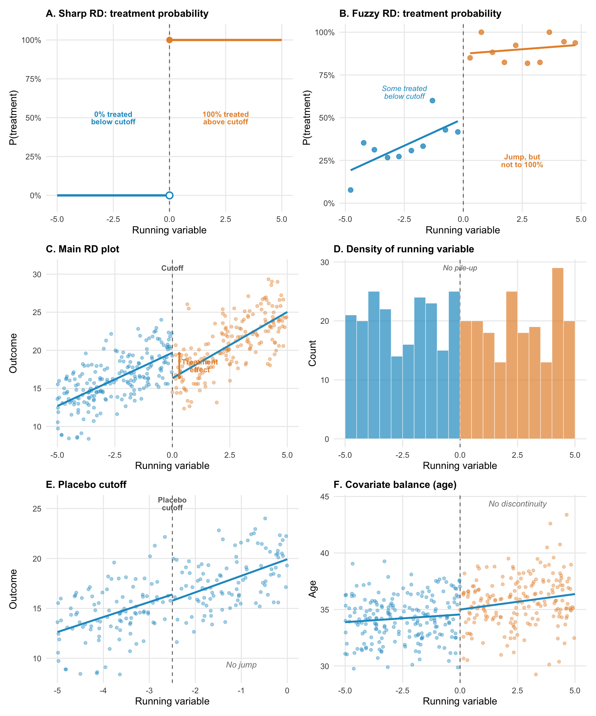 Placebo cutoffs (panel E) test whether your method is finding real effects or fitting noise. Apply the same RD analysis at fake cutoffs where no treatment change occurred. If you find “effects” at these locations, your method is detecting something other than the treatment.